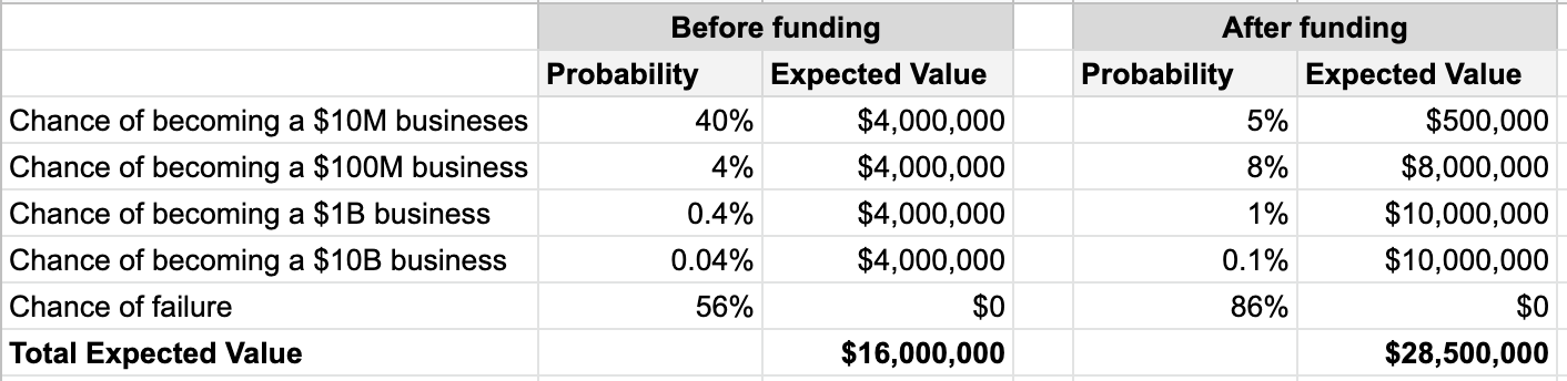 For example, Y Combinator is great at pushing all of their portfolio companies to think bigger and take bigger swings. For a good amount of their portfolio (let’s call it 20%), that may result in pivoting themselves into oblivion or crashing and burning what could have otherwise been a successful $50M business. This sucks for those founders, but this is YC’s model working by design. For the 20% of founders who end up with a worse outcome as a result of joining YC, there’s also the 20% who find themselves on a fast track to becoming a $1B company.