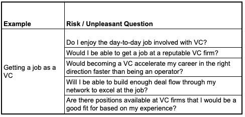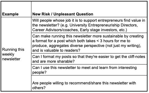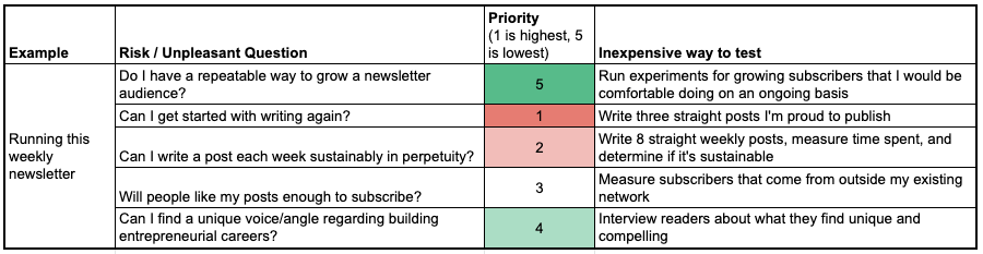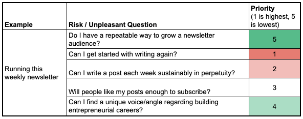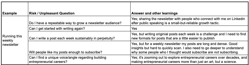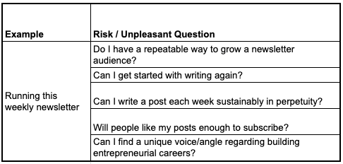 For example, when I was thinking about starting this newsletter, I was tempted to jump to traditional KPIs like “newsletter subscribers” to give myself an objective sense of progress. But growing subscribers isn’t a big risk – the biggest risks were those which if the answer was “no,” then (1) it would be hard or impossible to get subscribers, or (2) even if I got subscribers, the newsletter would eventually fail. Here were some of the risks which I framed as unpleasant questions:
