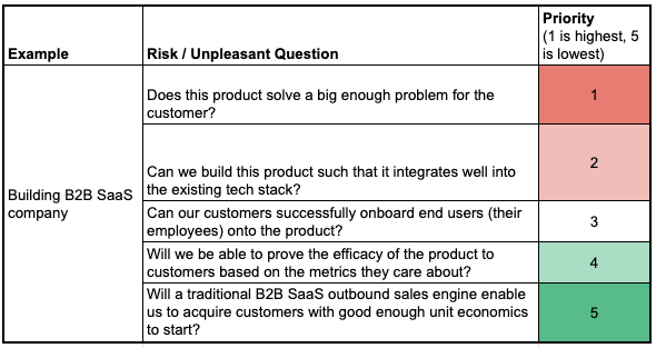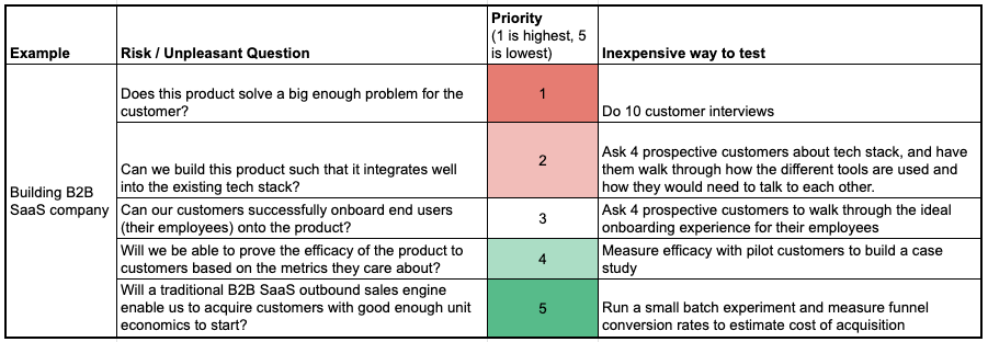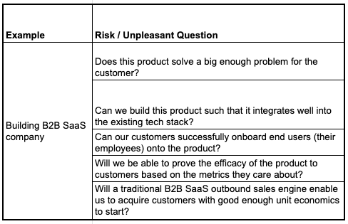 Trying to de-risk in expensive ways: The path to a “yes” or “no” with an unpleasant question is usually shorter than people think. For example, if a big risk for our B2B SaaS startup is “Can our customers successfully onboard end users (their employees) onto the product?” then there are two ways of figuring out that answer: (1) do in-depth interviews with four prospective customers to walk through the process of onboarding their employees onto your proposed product (which hasn’t been built yet), or (2) build the product with customer feedback and then measure the rate of end user adoption from pilot customers. The first method results in de-risking that big question in a few days, whereas the second method would take months and tens of thousands of dollars to get an answer. There are often going to be very inexpensive and fast ways to get answers to the biggest risks without needing to wait months. Later in the maturity of any investment, the learning cycles end up taking longer, but even then, de-risking as frugally as possible maximizes progress.