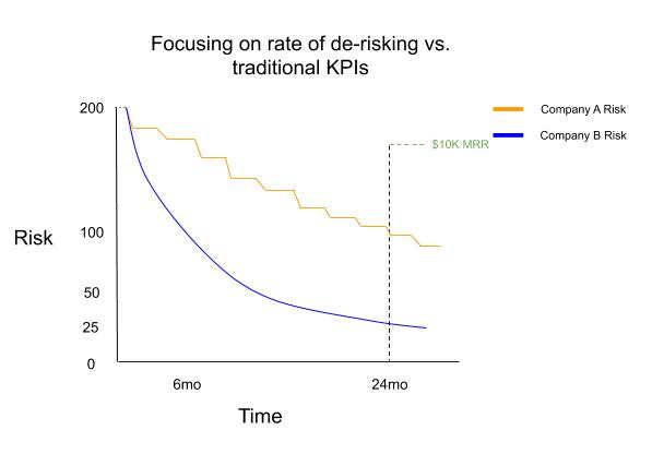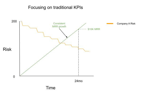 When focusing on traditional KPIs and not directly addressing risks, progress only occurs when we happen to de-risk parts of investments as a by-product of focusing on those KPIs. This is the path Company A is on.