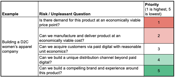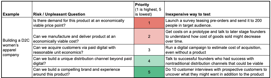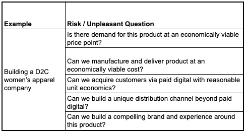 Whenever answering unpleasant questions and de-risking an investment, there are usually new risks that crop up which are more nuanced. Continuing this process of surfacing the biggest risks, prioritizing them, and de-risking them as inexpensively as possible is a never-ending cycle.