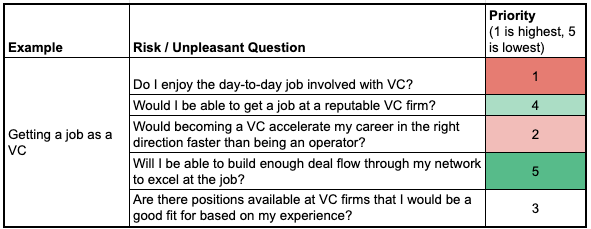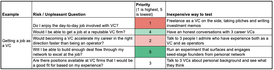 Not de-risking in parallel when possible: Some risks have limitations on how quickly you can get your answer, and some risks can be de-risked with the same experiment. De-risking in parallel, when possible, can further accelerate progress. For example, when considering getting a job as a VC, three of the risks are: (1) “Would I be able to get a job at a reputable VC firm?” (2) “Would becoming a VC accelerate my career in the right direction faster than being an operator?” and (3) “Are there positions available at VC firms that I would be a good fit for based on my experience?” The cheapest way to test each of those would be to have conversations with career VCs, diving deeper into each of those questions. Rather than addressing these risks sequentially, it makes sense to set up 3 conversations with career VCs who can provide unique insight to each of these questions. This idea of de-risking in parallel was part of why I joined the On Deck Writers fellowship: it was a creative solution to inexpensively de-risk (1) “Can I get started with writing again?” and (2) “Can I find a unique voice/angle regarding building entrepreneurial careers?” Answering those questions was my goal of going through the fellowship, and it worked.