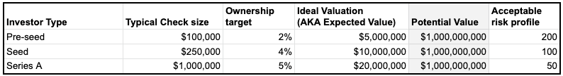 We can look at this through the investor lens, where Pre-seed investors, Seed investors, and Series A investors all have different expectations in terms of risk profile of their investments and expected value.