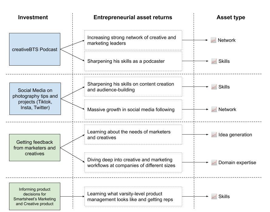 Entrepreneurial assets: Assets like relevant network/audience, skills, and domain expertise. These are built up over the course of an entrepreneur’s career and are invested wherever time is being spent. Entrepreneurs can take these assets with them wherever they go, and investing them does not deplete them.