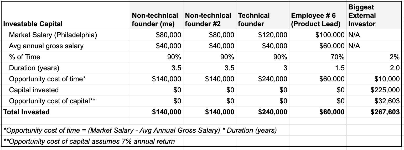 Diving into the first part of the equation (Investable Assets Invested), the math proves what I learned after winding down my startup in 2018. Based on the Investable Assets Invested alone, my co-founders and I really were the biggest investors in the company when factoring in the opportunity costs of our time (the difference between market salaries and what we were paying ourselves).