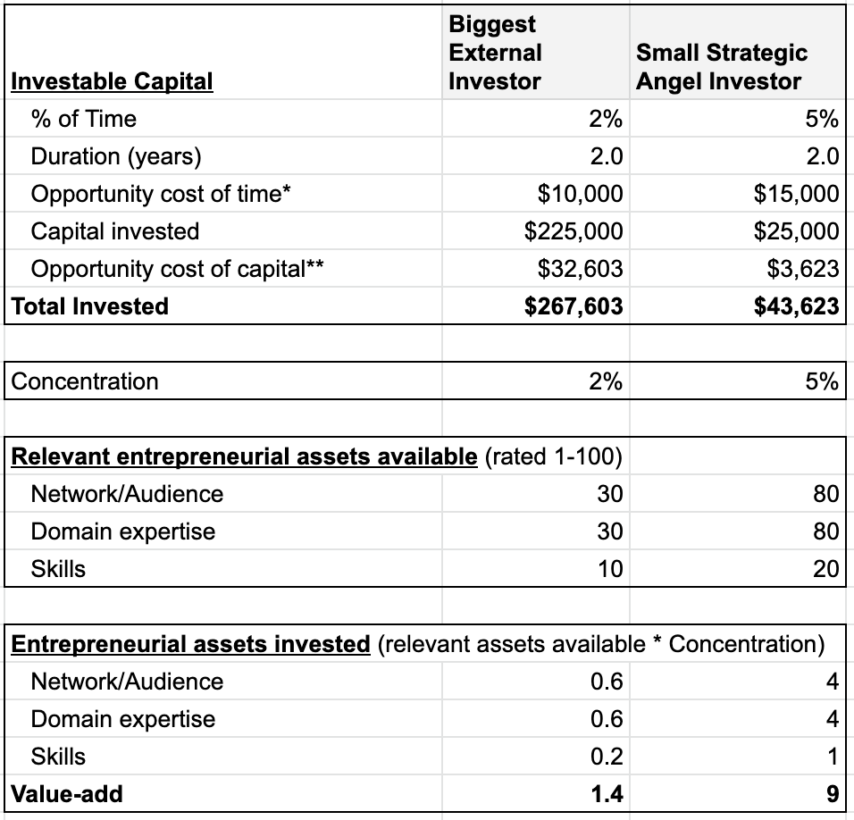 Suppose Investor A invests $225K in capital and commits 2% of their time (like my biggest investor). Investor B is a small strategic angel writes a $25K check, commits 5% of their time, brings an exceptional network/audience to the table, and has deep domain expertise on the space of the startup. If we score the value of their entrepreneurial assets that they bring to the table, we can see that while Investor A is investing ~4x as much money, investor B is adding ~4x as much value. Despite a $200K difference in the money being invested, their investments are roughly the same in true value.