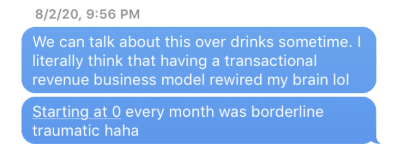 Similarly, when building my first startup (Compass, Upwork for web design projects), we decided that the best product for our customer was a project-based model where they only paid for web design projects and didn’t pay a subscription. This meant that every month, our revenue started at zero. Years later, I still sometimes text my old co-founder things like this after a few drinks: