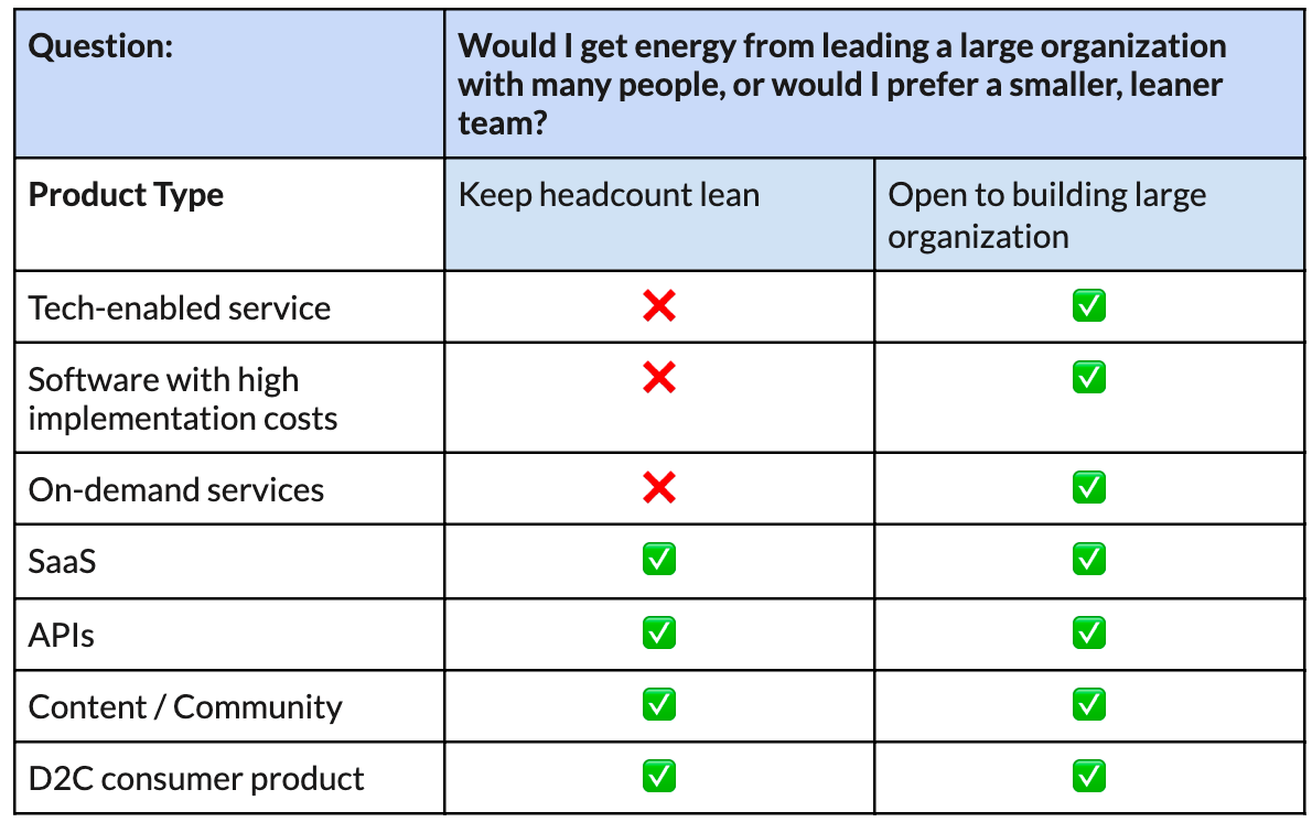 Similar to optionality vs. swing-for-the-fences mentality, our willingness to build a large, people-heavy organization impacts the types of products we can build.
