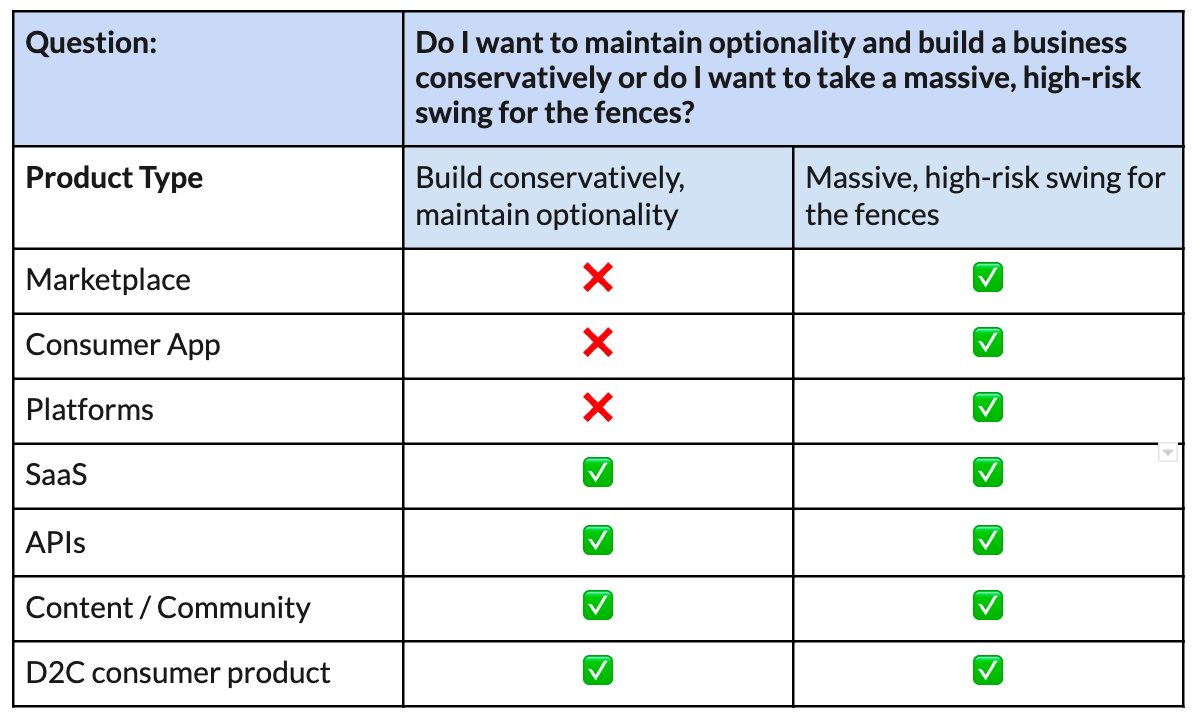 Do I want to maintain optionality and build a business conservatively or do I want to take a massive, high-risk swing for the fences?