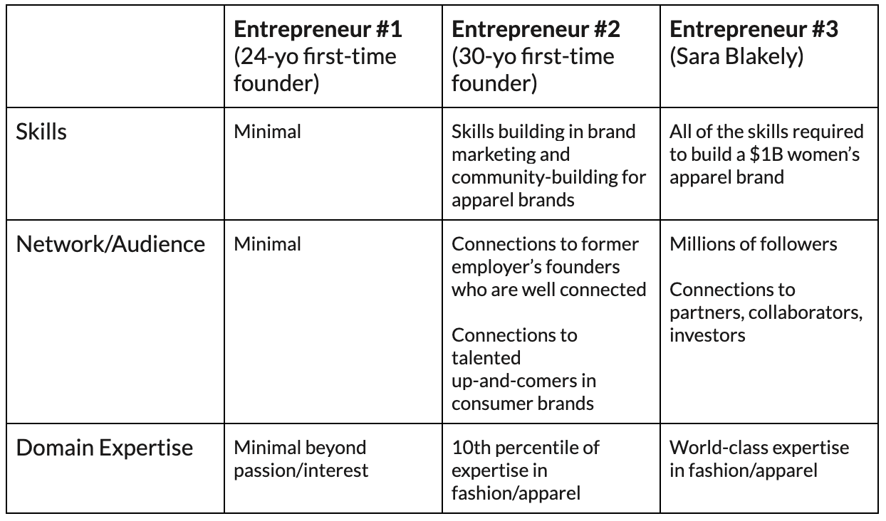 For example, suppose three entrepreneurs have the same idea for a women’s apparel company that has the potential to be a $1B business, but bring different entrepreneurial assets to the table: