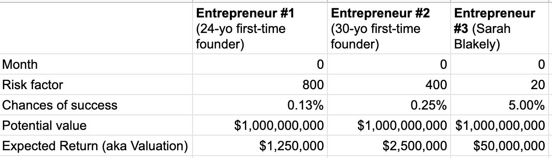 If Entrepreneurs #1 and #2 were excellent entrepreneurs and were able to de-risk their ventures by 10% month-over-month consistently, it would take Entrepreneur #1 36 months and Entrepreneur #2 29 months to get to where Sarah Blakely was on day 1.
