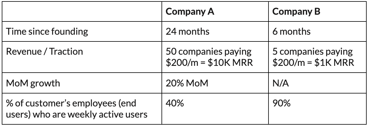 Company A has more traction – they’ve been at it for 2 years, have 10x as much monthly recurring revenue, and are growing 20% month-over-month – indicating that they’re starting to figure out how to grow. But Company B, which has 1/10 as many customers and revenue, is not yet growing, and has only been at it for 6 months – has made more progress. One of the biggest risks with selling a B2B productivity tool is end user adoption. The fact that 90% of their customers’ end users are weekly active users shows that Company B has figured out (AKA de-risked) that part of the business, while Company A has not. If I was an investor, I would bet that if you fast forwarded 12 months, Company B would end up with just as much traction as Company A, and would have a faster growth rate. While it’s seductive to focus on traction early on because it’s the easiest to measure, at the end of the day, whether you have $1K in MRR, $5K in MRR, or $20K MRR, if the startup fails, it all rounds down to zero anyway.