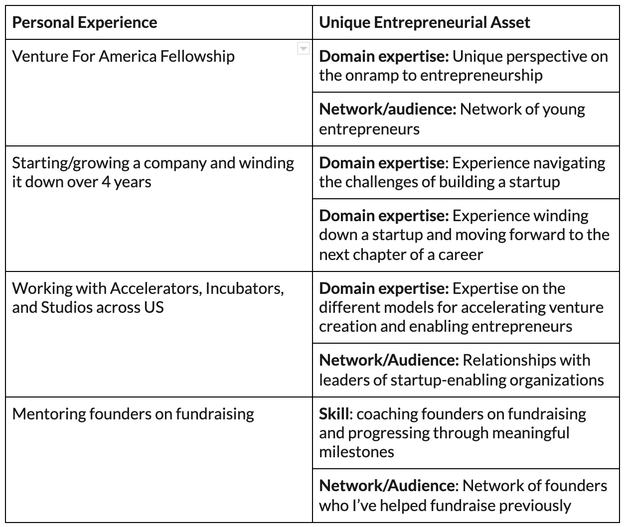 We already have experiences which give us a unique blend of skills, network/audience, and domain expertise that would be relevant for some venture. Reflecting on our existing entrepreneurial assets and can give us an answer to the question: “what type of venture would leverage my unique experiences would give me a big day 1 advantage?”