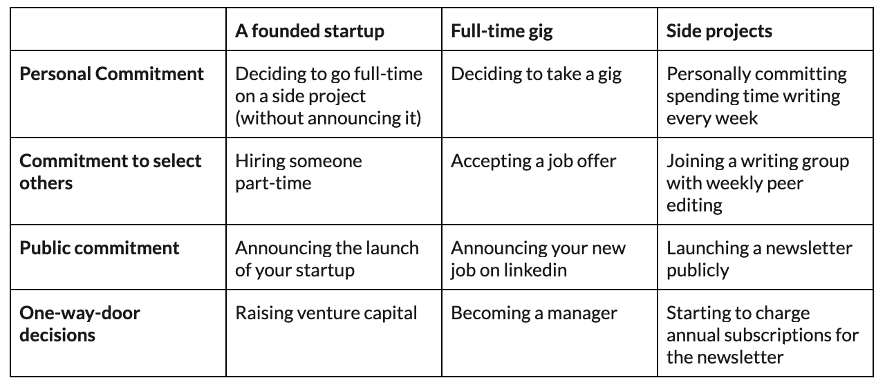 Whether intentionally or not, we make these commitments all the time with our own startups, full-time gigs, and side projects. Whenever we make these commitments, we are losing optionality – it’s just a question of how much.