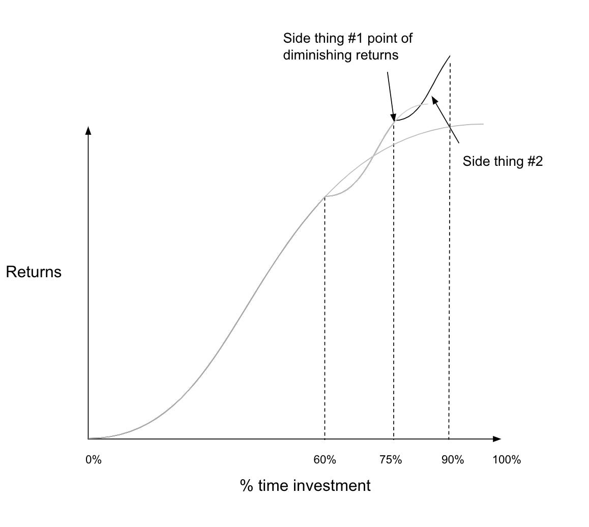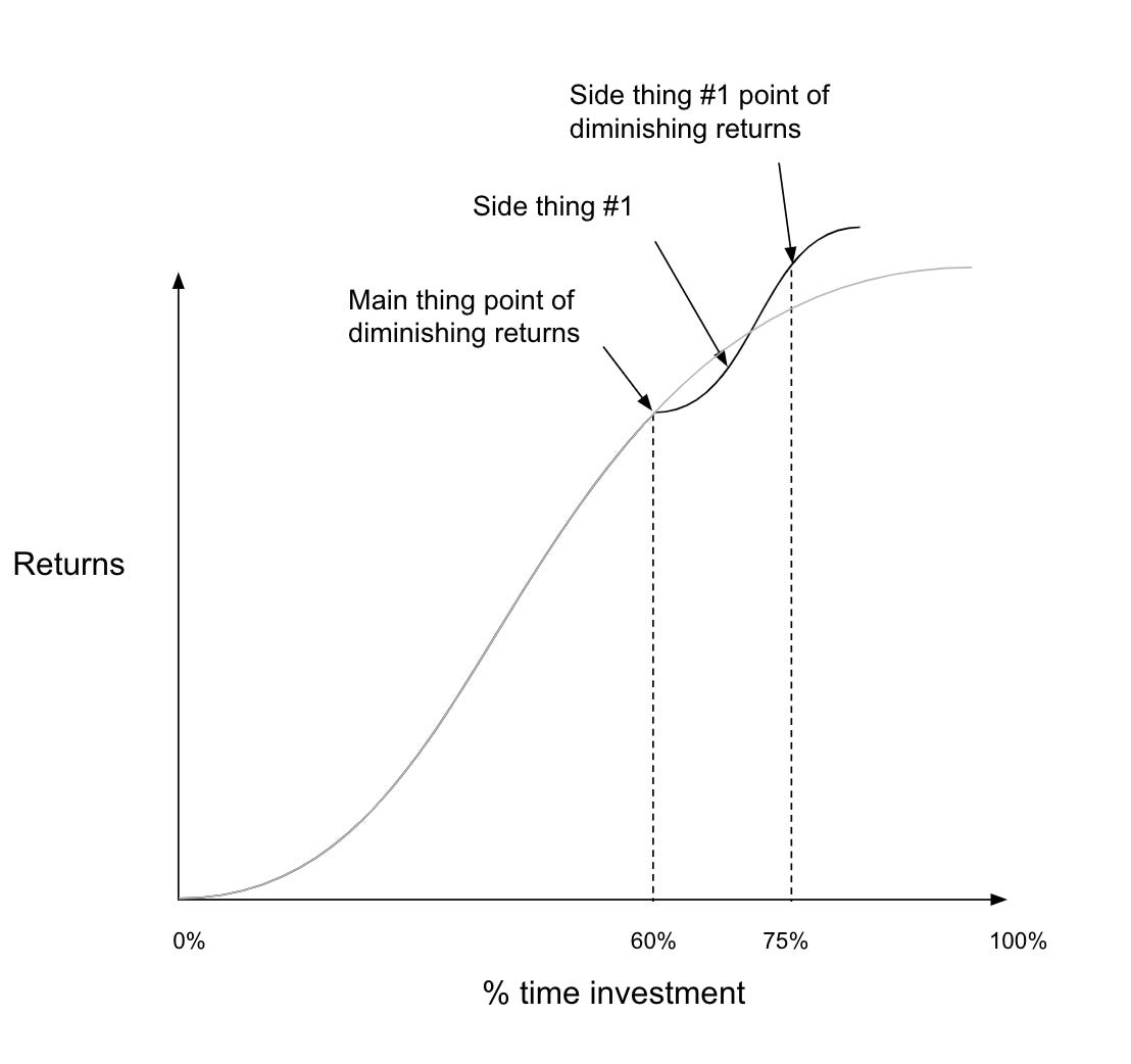 We break our time into “main things” and “side things” which give us returns on our time in the form of money, network/audience, skills, and domain expertise. There’s usually a point of diminishing returns on our “main thing,” which is the point at which diversification into side projects is a viable option. We shouldn’t diversify earlier than the point of diminishing returns.